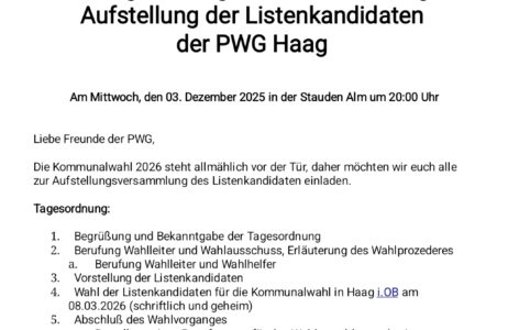 Am kommenden Mittwoch, 22. Oktober, um 20 Uhr, im Hofcafé Grandl findet die Aufstellungsversammlung der PWG Haag, Parteifreie Wählergemeinschaft, zur Aufstellun...